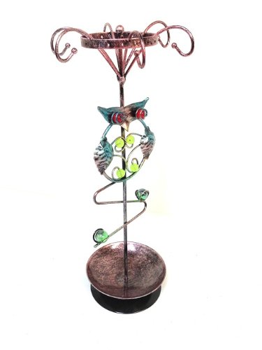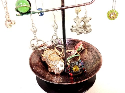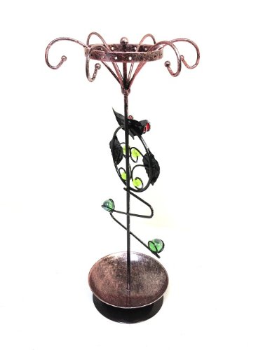 6 Long Hooks for bracelets or Necklaces . A bowl for Rings.18 Holes for Earrings. Can hold up to 36 pair of earrings by putting one pair in each hole and on the side