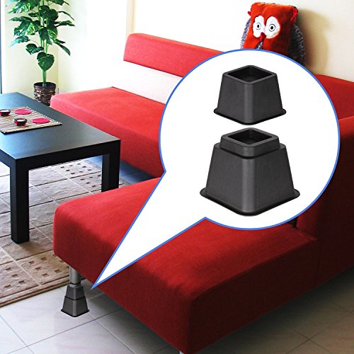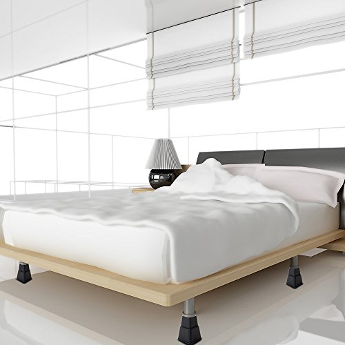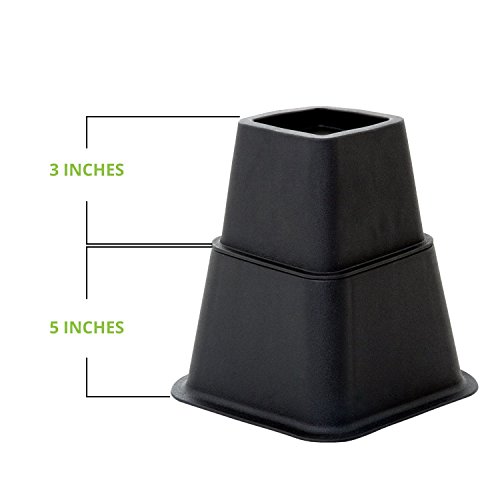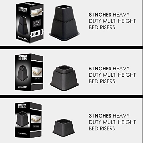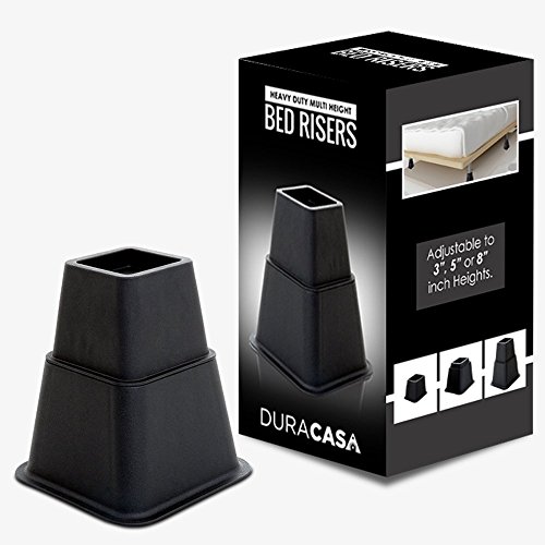 Studio : DuraCasa Publisher : DuraCasa Product Description DuraCasa Heavy Duty Bed Risers Are you always short on storage space? We have a quick and inexpensive solution for you. Introducing our Heavy Duty Bed Riser set. The DuraCasa bed and furniture riser set was specifically designed and manufactured to lift your bed, desk, table, or any other furniture an additional 3 or 5". This Heavy Duty Bed Riser Set has the following features: ??????Each unit can hold up to 500 pounds, for a total of 2000 pounds! ??????Every piece of the bed riser's recessed top can securely hold a bed frame foot up to 2.75 inches wide ??????Safe to use on Hardwood floors. Won't Scratch or Dent them. ??????Increases space under your bed for extra storage. Up to an incredible 29 cubic feet of extra storage space! ??????Attractive Black Finish that goes well with all furniture Multi functional, can be used in your home or office! Suffer from Acid Reflux? Use 2 of the units at the head of your bed to help elevate the bed and reduce the acid. Pregnant or have issues with blood circulation problems? No problem you can use 2 of the units and elevate the end of the bed only. 100 percent money back guarantee! Click the ADD TO CART Button TODAY!