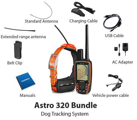 The Garmin Astro Bundle w/T5 dog tracking GPS system is high sensitivity GPS enabled dog tracking system for hunters and sportsmen. This unique system pinpoints your dogs position and shows you exactly where he is, even when you cant see or hear him. The new Astro 320 Bundle handheld GPS device has features like increased range, a simplified user interface and must-have mapping capability.