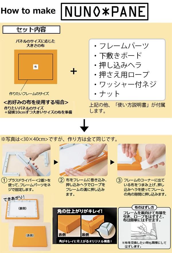 | セット内容 | フレームパーツ、下敷きボード、押し込みヘラ、押さえ用ロープ、ワッシャー付ネジ、ナット、布、使い方説明書 |