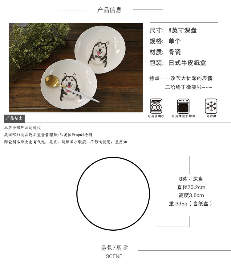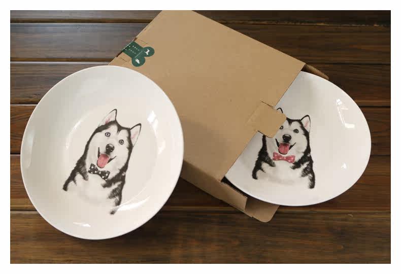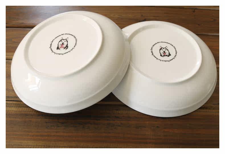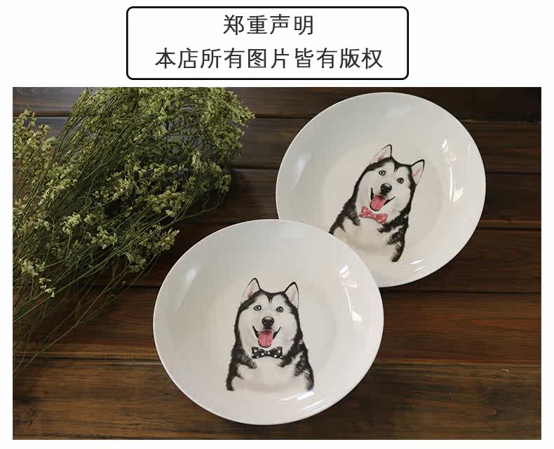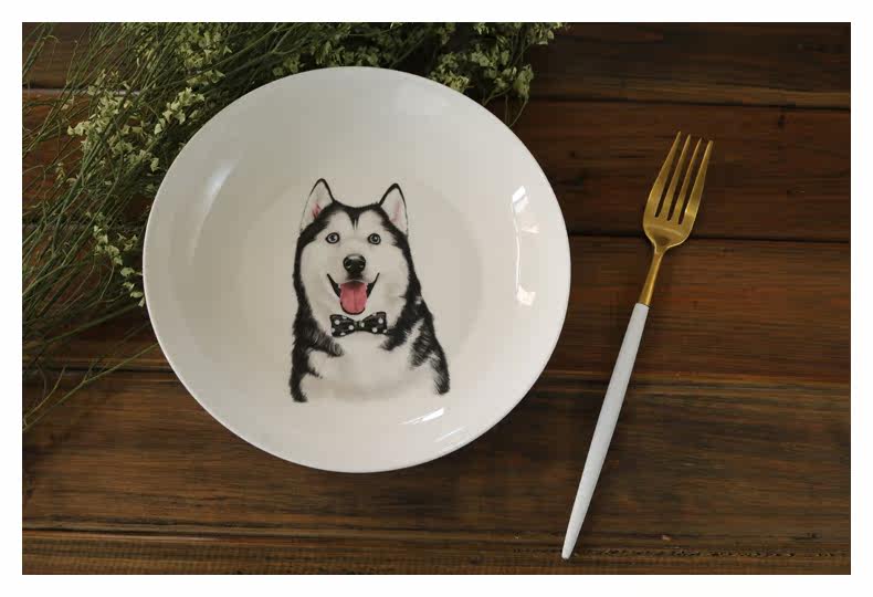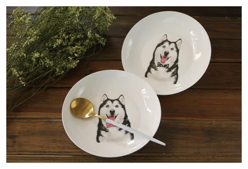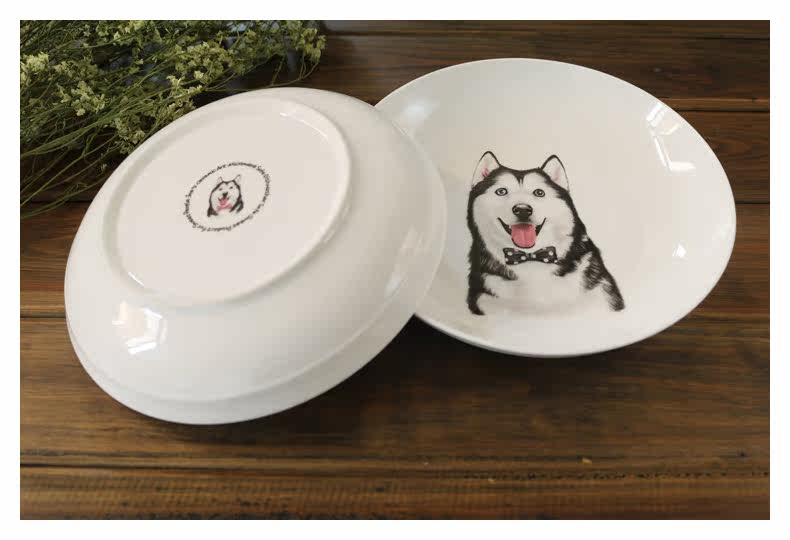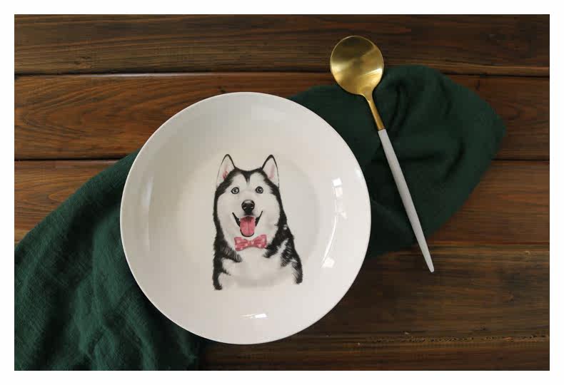 可爱动物家用8寸饭盘哈士奇餐具意面深盘陶瓷盘菜盘骨瓷西餐盘子