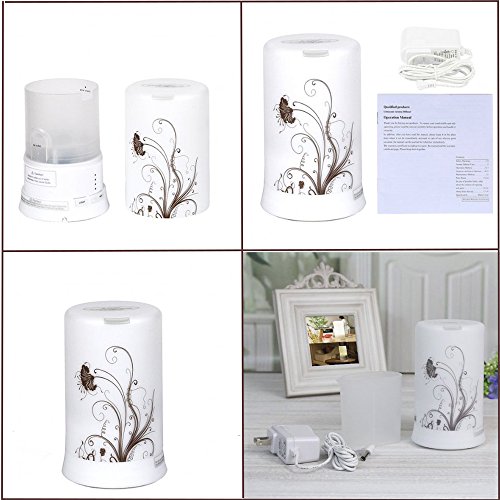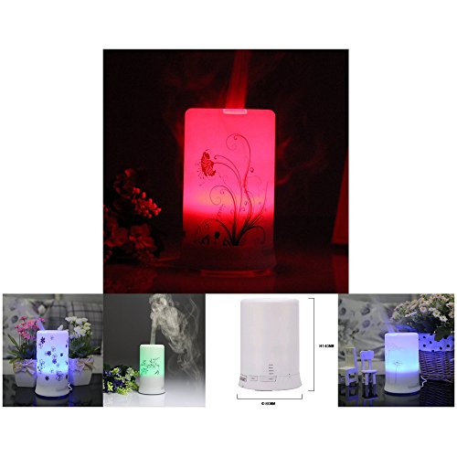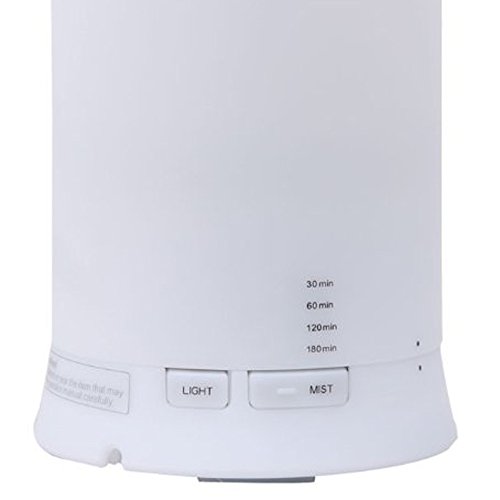 - Feature : Use Ultrasonic waves to instantly vaporize water and essential oil in the tank, to produce a cool, dry fragrant mist. / 4 Timer settings: 30/60/120/180 minutes. Monitor the shortage of water automatically and ensure the safety. / There are 4 colors with 2 light degree levels available. Colorful changing by using automatic or manual mode, romantic and warm. / Whisper-quiet ultrasonic operation, monitor the shortage of water automatically and ensure the safety. / Produces "happy feeling" negative ions which help to lift your mood, strengthen the immune system and relieve stress.