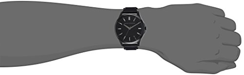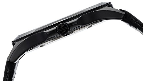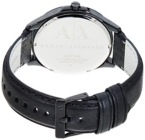 An attractive men's Armani Exchange watch with a stainless steel case and black genuine leather strap features index hour markers. It has a fixed gold plated bezel and analog display with minute markers around the outer rim. It is scratch resistant and 50 meters water resistant.