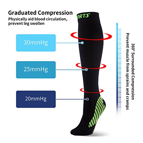 - True Graduated Compression - From ankle (30mmHg) to calf (20mmHg) provide medical therapy for blood circulation. Best compression range to prevent varicose veins and treat early varicose veins . Effectively relief feet and legs' tired, sore, pain, swollen, cramp, edema and other leg issues caused by circulation problems and long time standing. Also reduce the risk of injury during sports and daily exercise