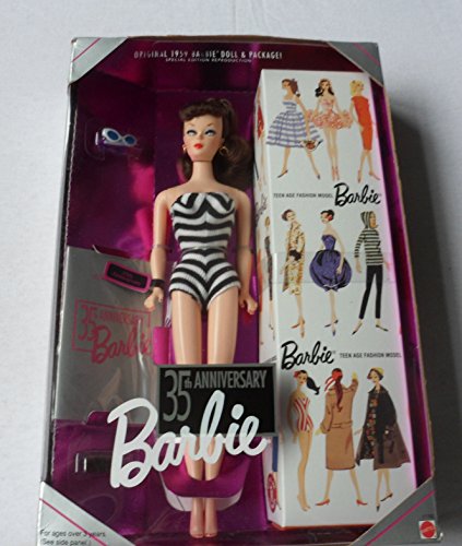 -. Feature : 35th Anniversary Barbie Doll Original 1959 Barbie Doll & Package! Special Edition Reproduction is a 1993 Mattel production. / Includes: 11.5" Barbie doll w/brunette hair; wears white & black stripe Bathing Suit & comes w/original copy of Package (box), doll Sun Glasses, black slip on hi heel Shoes & a Booklet, / All sizes, colors, styles & info are approximate; may vary. / For Ages 3+ Years. WARNING: Choking Hazard/Small Parts. / Great for any collection, as a gift or just for fun play!