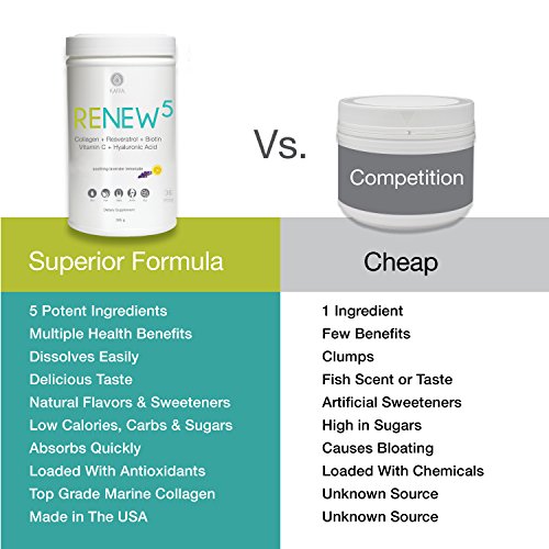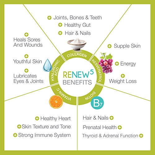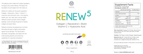 Studio : Kaffa Skincare Publisher : Kaffa Skincare Binding : Health and Beauty Product Description About ReNew5 Reward yourself with the gift of wellness and longevity with Kaffa Skincare's ReNew5 skin rejuvenation and hydration drink mix. We believe the foundation of youth begins from the inside out. This delicious drink is filled with 5 potent ingredients for beauty and overall wellness: Collagen Resveratrol Biotin Vitamin C Hyaluronic Acid and exotic roots. Together this unique combination of nutrients supports healthy skin, hair, nails, joints, and gut health. Powerful marine collagen peptides stimulate the growth of healthy collagen and elastin fibers. Resveratrol, a powerful antioxidant found in red grapes, hydrates and nourishes the skin. Biotin, Vitamin C and Hyaluronic Acid are key ingredients required by the body for optimal skin, hair and nail health. ReNew5 reduces the appearance of wrinkles, diminishes the signs of aging, and protects against future damage. This natural blend rehydrates, reinvigorates, and repairs the skin while boosting elasticity and enhancing suppleness for a glowing complexion. 0 |