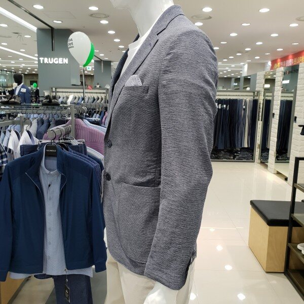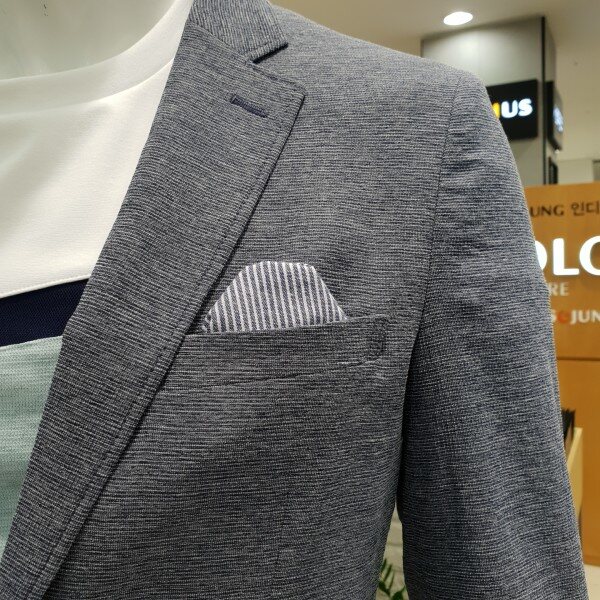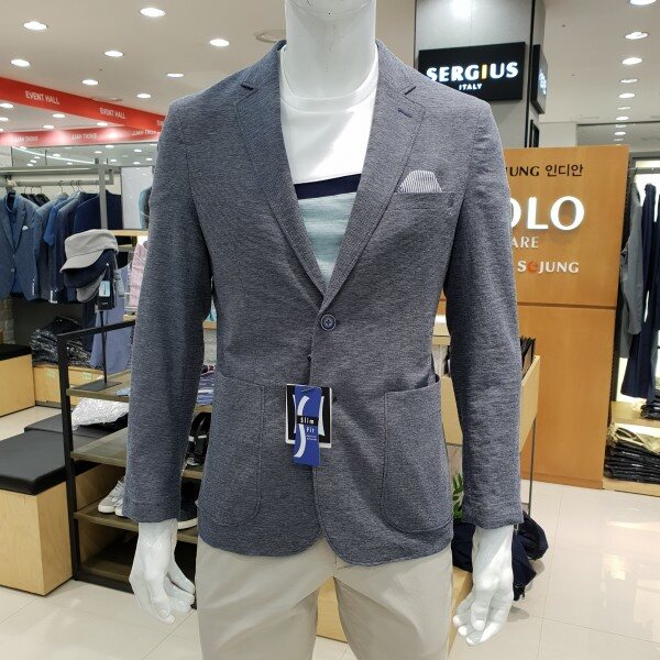 . 베이직한 기본 투버튼의 슬림핏 자켓입니다. 시원한블루 멜란지 컬러의 자켓입니다. 구김이 덜가는 소재를 사용하여 관리가 용이합니다