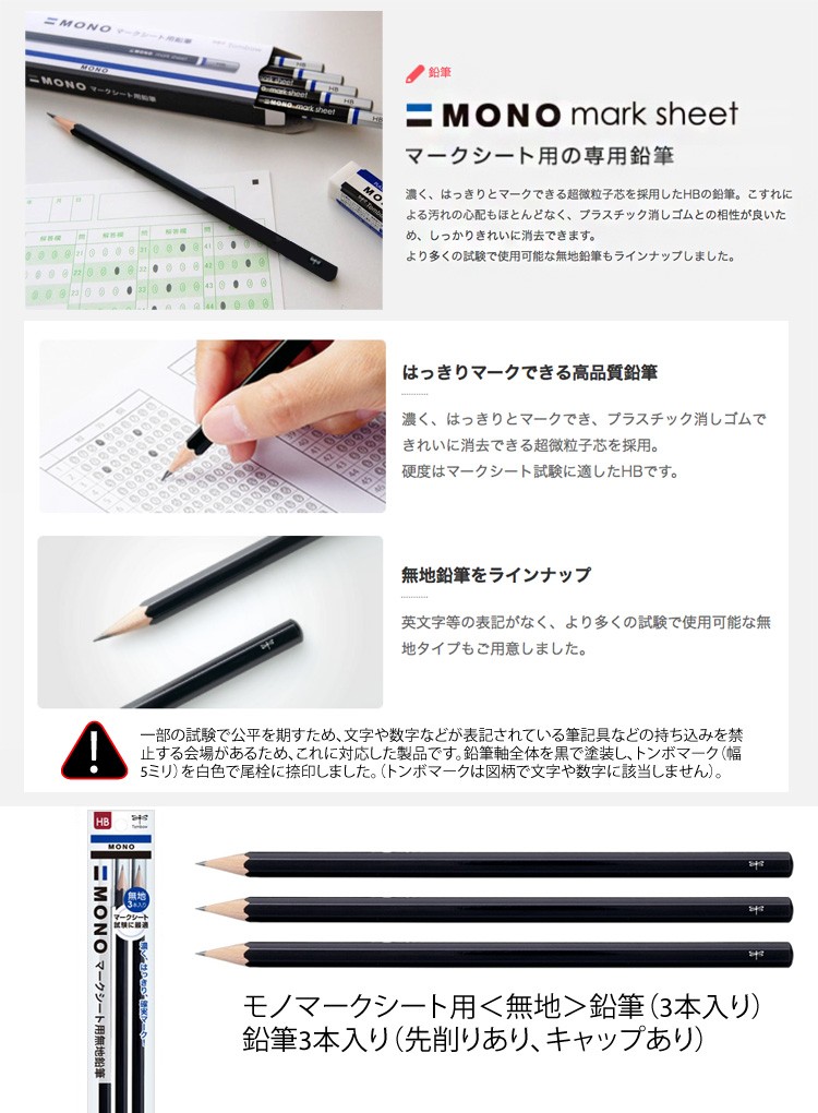 濃く明瞭にマークできる当社のハイグレード超微粒子芯を採用しました。プラスチック消しゴムできれいに字消しできます。 鉛筆軸は一部の試験で公平を期すため、文字や数字などが表記されている筆記具などの持ち込みを禁止する会場があるため、これに対応した製品です。鉛筆軸全体を黒で塗装し、トンボマーク(幅5ミリ)を白色で尾栓に捺印しました。(トンボマークは図柄で文字や数字に該当しません)。