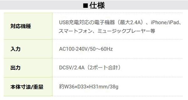 fk094igrjs小さくてハイパワースマホやタブレットを2台同時に充電できるコンパクトなUSB充電器です サイズ 個装サイズ:8.3×3.6×17.6cm 重量 個装重量:60g 仕様 ・使用方法は台紙に記載 ・保証期間:6ヶ月 生産国 日本 スマホやタブレットを2台同時に充電可能 小さくてハイパワースマホやタブレットを2台同時に充電できるコンパクトなUSB充電器です