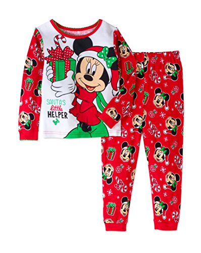 Minnie Mouse, Minnie to her friends, is the girlfriend of Mickey Mouse. She is known for her iconic ears, accented with a decorative bow and her infectious happy attitude and bright smile. This officially licensed Disney toddler little girls pajama set features a gorgeous Minnie Mouse. Minnie Minnie is wearing a Santa hat and her bow is deck out with festive holiday graphics. The script logo says "Santa's Little Helper." Made of 100% cotton. Purchase a size that is a snug fit.Feature