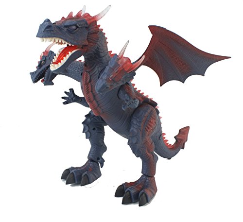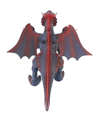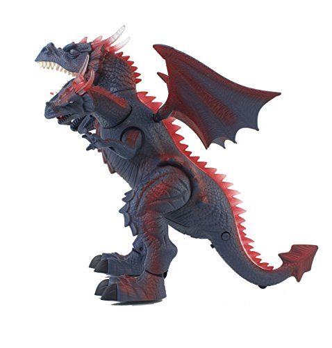 -. Feature : REMOTE CONTROLLED - Control your dragon with the press of a button on the flashlight remote control. It will walk, roar, and flap its wings as you press it. Or you can press the button on the dragon's tail so it moves on its own / LIGHTS & SOUNDS - Look as your dragon roars and lights up the spikes from head to tail in different colors! / MOVING WING/MOUTH ACTIONs : As your dragon moves, you can see its wings flap as well! See it move its multiple mouths to roar / FORWARD WALKING - Your dragon will walk in a linear, forward direction. / Recommended for ages 3+. Dragon requires 3 AA Batteries (included) Flashlight Remote Control requires 2 AA Batteries (included) Dimensions 15 x 14 x 12 in