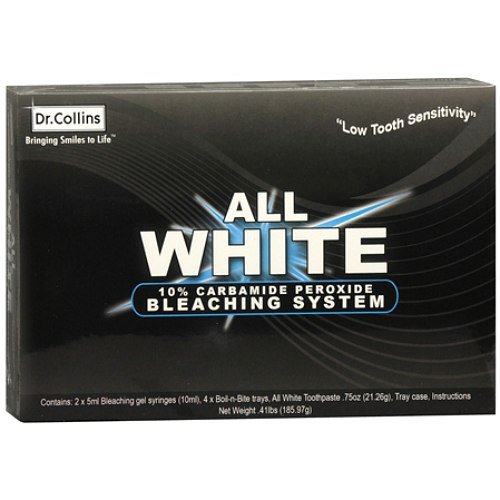 -. Feature : Dr. Collins All White 10% Carbamide Peroxide Bleaching System 1 ea / Warnings Tooth Whitening (bleaching) gel will only whiten natural teeth. It will NOT bleach (whiten), nor harm bonding, caps, crowns, bridges, fillings or any other artificial dental work. You may have to have the dentistry redone in order to match your new white teeth. Tetracycline (an antibiotic) stained teeth or grayish teeth are more difficult to bleach and have varied prognosis. Exposed root portion of teeth which occurs with gum recession will also not bleach. If you have amalgam (silver) fillings in, near or behind the front teeth, long term bleaching can cause the surrounding tooth to have a greenish tinge. Bleaching teeth which have a lot of translucency (see thru) can cause the teeth to become even more translucent and may give the tooth a darker appearance. It is important to consult a dentist if you have any of the above concerns. Whitening Disclaimer Individual bleaching results vary and particular results cannot be guaranteed. It is essential to follow the enclosed directions consistently. Not following the instructions can damage teeth and gums. In some instances, bleaching may result in blotchiness and/or a non-uniform tooth surface. Other unexpected results can also occur and maybe permanent. When purchasing any bleaching agent, buyers are accepting all risks associated with tooth bleaching and release and hold harmless the manufacturers and distributors, and their agents, employees and P.R.Incipals for any issues, injury, harm, or complications that may arise from or are associated with bleaching. Nearly all tooth bleaching studies have been conducted with 10% carbamide peroxide (CP). Use of higher strength gels should only be used at one's own risk. We are not liable or responsible for adverse effects that higher strength gels may cause.