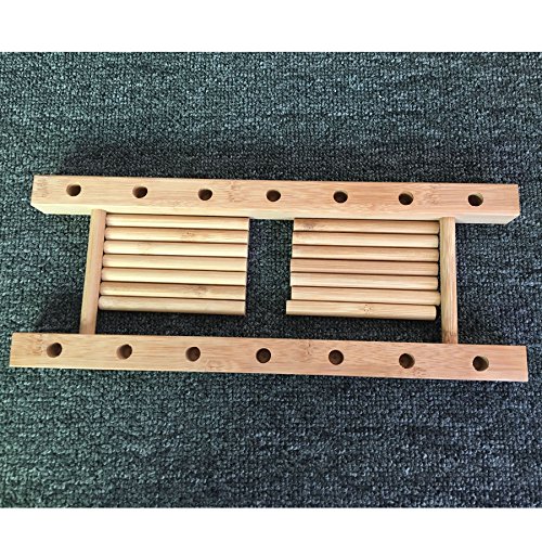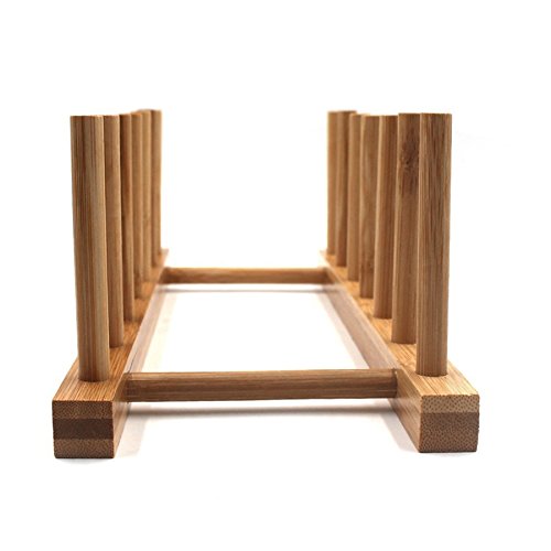 MrBambu Bamboo Kitchen Dish Cup Rack: - Made of sturdy, eco-friendly, and easy-to-clean bamboo. Surface special treatment, not easy to get mildew. No crack, no deformation. - Bamboo wood appearance work for a variety of different themed kitchens. - The weight is light, the size is convenient for a compact kitchen, small counter space. Very Sturdy to hold 6pcs dishes/ lids/ etc, and one plate/lids/etc per slot. - Easy to install: It comes with 16 short sticks, the two long racks, each rack have two holes. When install, push the pegs into side racks with a little big pressure, then the whole rack will be tight.