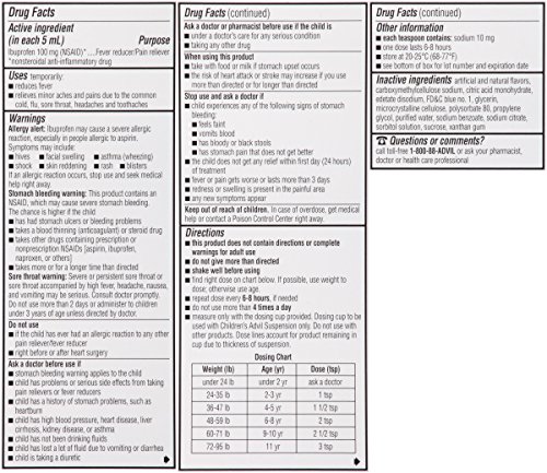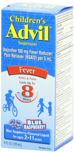 Studio : Advil Publisher : Advil Binding : Health and Beauty Product Description When fever is running through your house, turn to Children's Advil Suspension to reduce fever fast*. Up to 8 hours of relief with just one dose for children aged 2-11. Available in 6 great-tasting flavors: Sugar-free Dye-free Berry, Bubble Gum, Grape, Blue Raspberry, Fruit, and Dye-free White Grape * Based on reducing fever below 100degF 0