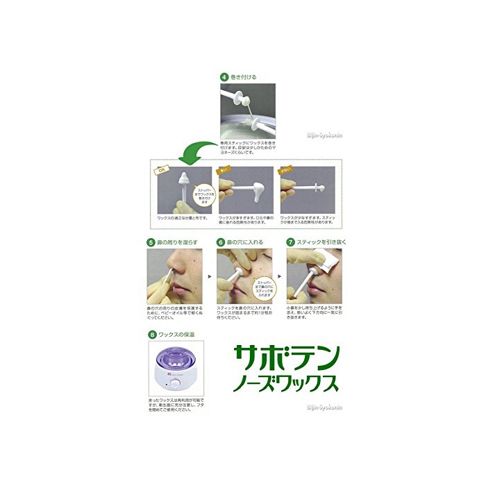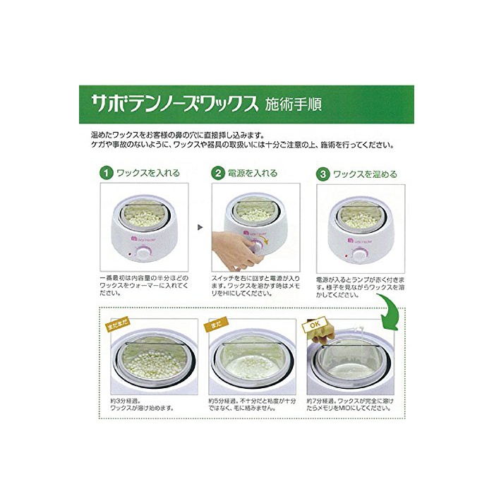 ■사용 방법 워머(Warmer)에 전용 왁스를 녹이고, 전용 스틱에 얽히 잡습니다.코에 스틱을 만들어 넣음(담는 그릇·상자 등),왁스가 완전히 굳어질 때까지 움직이지 않고 조금 둡니다. (최저1 분정도~) 왁스가 굳어지면 스틱마다 뽑아내는 것으로,비털을 빼기 잡습니다.