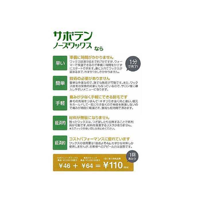 ■비모탈모는 간단하고 짧은 시간에 할 수 있는 전용 스틱을 코에 넣고,왁스가 굳어질 때까지 약1분.소요 시간이 짧고, 미용실의 대기 시간 등에도 할 수 있는 일이 특징입니다.코스트 퍼포먼스로 뛰어나 경제적 일시에 사용하는 왁스는 불과 4g정도(쯤).왁스는 재이용할 수 있기 때문에 코스트 퍼포먼스보다 뛰어나 있습니다. ■업계 최초!전용 스틱에 안전,경제적에 비모탈모를 행할 수 있 선인장 노즈 왁스 전용 스틱은,스토퍼가 붙고 있고, 코의 점막까지 왁스가 들어 가는 것을 막습니다.또한 왁스의 감음 붙이가 간단하고 적당량이 알기 쉽게 왁스의 낭비를 나오게 하게 하지 않겠다.