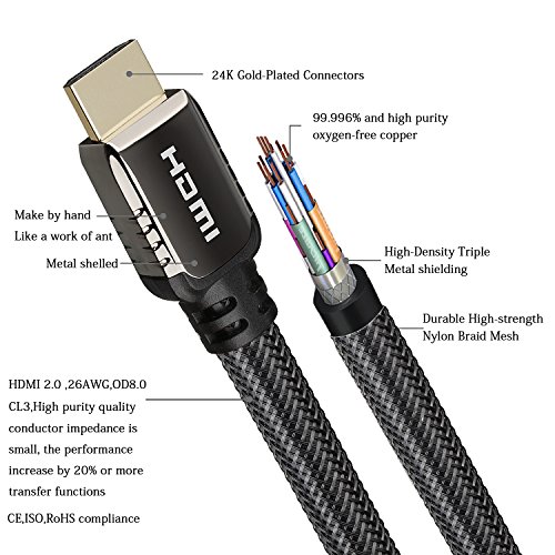 High-Speed HDMI Cable features 24K gold-plated, 99.996% and high purity oxygen-free copper, corrosion-resistant connectors that deliver optimal signal transfer with lower distortion at the point of contact. Ultra-high speed lossless audio and video transmission,This dedication to the digital signal provides sound and picture quality that is truer to the original. high quality PVC, Tough braided exterior outer layer and shielding, purity of the digital signal and longer service life.