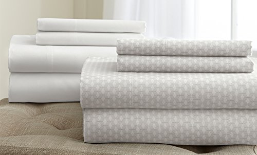 Studio : Amrapur Publisher : Amrapur Binding : Kitchen Product Description A geometric pattern pairs with a simple solid design to form this convenient sheet set. Crafted with a soft microfiber polyester blend, this set features two flat sheets, two fitted sheets and four pillowcases to brighten up your bedroom.;King : flat sheet- 106x102", fitted - 78x80", pillowcases- 20x40" 0
