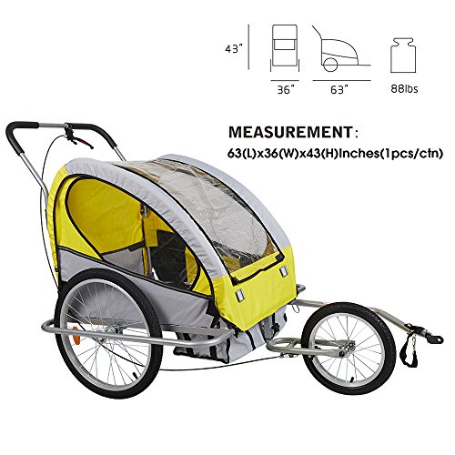 -. Brand : KARMAS PRODUCT -. Color : yellow -. Department : girls,boys -. Feature : Back bike brakes can help you stop promptly in case of emergency,erusure safety / Maximum weight capacity:88 lbs. Product Weight: 33lb.Dimension:35.4''x51''x39'' / Universal bike hitch to rear axle included. Trailer remains uP.R.Ight even if bike tips over / The seat is pocketed to secure the child better.It can be seat for 1 or 2 children.seat size:29''(L)x23.6''(W) / Front bicycle with the bike trailer can be fixed for jogging.Seat belt included to eusure safety of child. -. Label : KARMAS PRODUCT -. Manufacturer : KARMAS PRODUCT -. MPN : 168 -. PartNumber : 168 -. ProductGroup : Sports -. ProductTypeName : OUTDOOR_RECREATION_PRODUCT -. Publisher : KARMAS PRODUCT -. Studio : KARMAS PRODUCT -. Title : KARMAS PRODUCT Double Child Baby Bicycle Carrier Bike Trailer Jogger Stroller(blue,red,yellow)