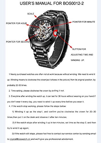 -. Title : BOS Men's Automatic self-wind mechanical Pointer Skeleton Watch Black Dial Stainless Steel Band 9008