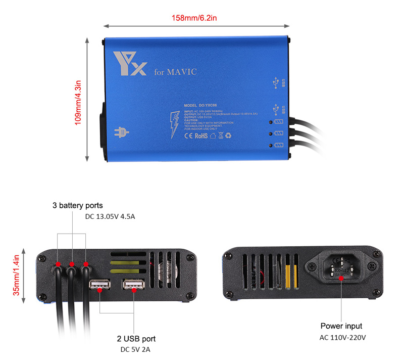 5 in 1 charger, specially designed for DJI Mavic Pro RC Quadcopter. Can charge 3 batteries at one time, dual USB port can output 5V/2A power for Mavic Pro remote control and smartphone charging. intelligent temperature control, when temperature rise up, fan will speed up automatically, when charge controller only, fan will stop since current is low. If temperature is too hot after discharge, charging will stop till temperature back to normal for protection.