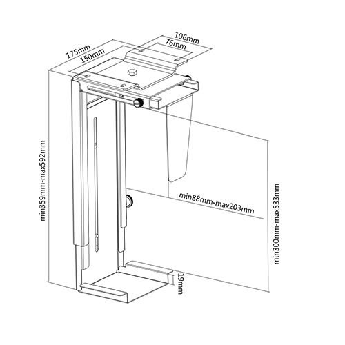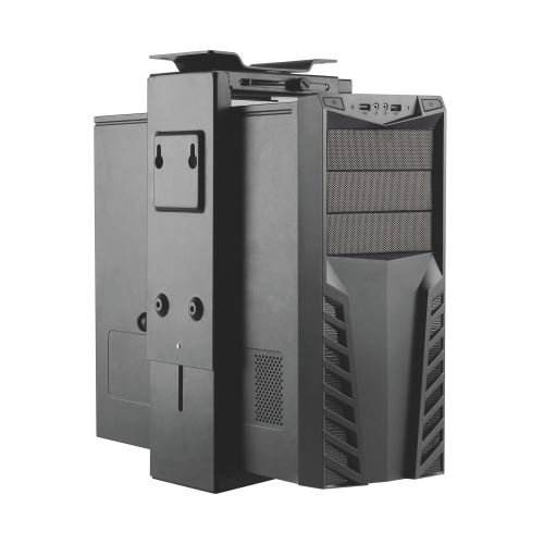 -. Feature : Fits most PCs / Adjustable height and width / Installs under desks or on walls / 360 degree swivel