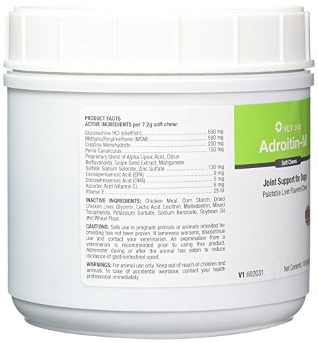 -. Feature : Adroitin-M Soft Chews Support healthy joint function and connective tissue in elderly dogs, large breeds and dogs that are predisposed to mobility and joint dysfunction / Active ingredients per 2 beef-and-liver flavored chews include: Glucosamine HCI 99+%, 500 mg MSM 99%, 500 mg Perna Canaliculus, 150 mg Creatine Monohydrate, 250 mg EPA, 9 mg DHA, 6 mg / Beef and Liver flavored, Made in USA