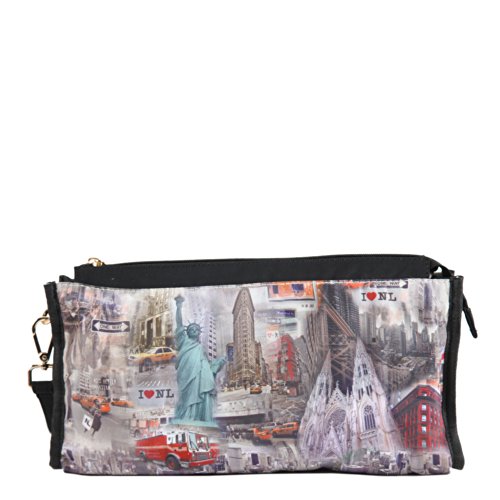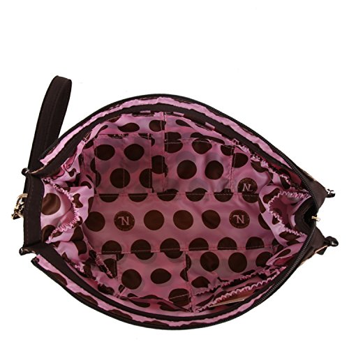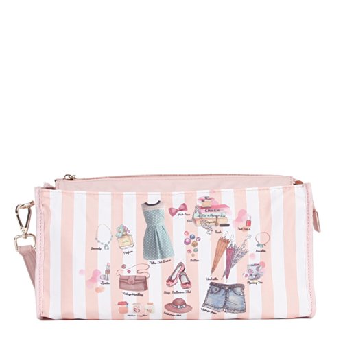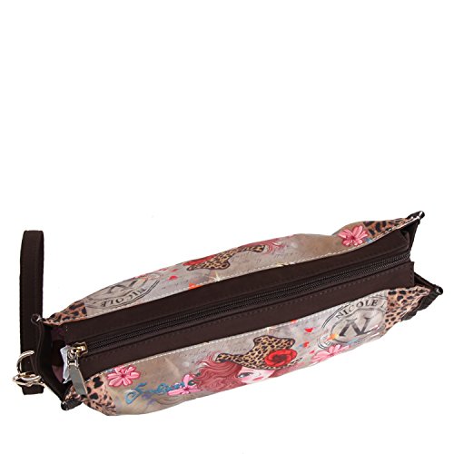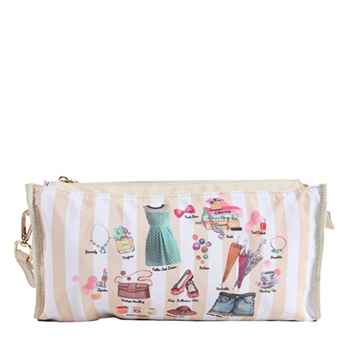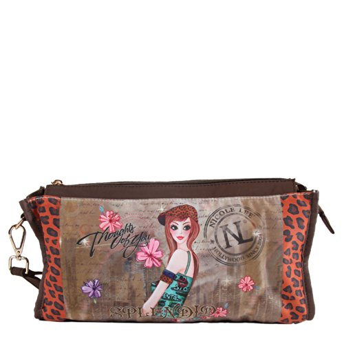 Keep everything easily accessible with this handy Nicole lee catriona personal travel bag. Key features: organizes your handbag, easily change in between bags or can be carried on its own and printed with the most popular Nicole lee's prints. Exterior features: made of nylon, Nicole lee print all around, gold tone hardware and zipper closure. Interior features: purse organizer: 17 slip pockets and polka dots print satin lining. Includes detachable 7 inch inch wristlet. Colors available are marina, dolly, sunny, Tina, new York, bicycle, doll house (peach), doll house (yellow), doll house (natural), doll house (blue). For cleaning, wipe with damp cloth.Feature