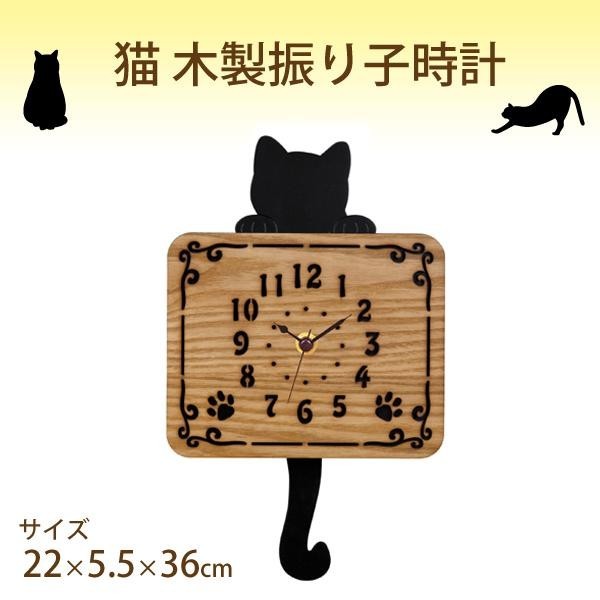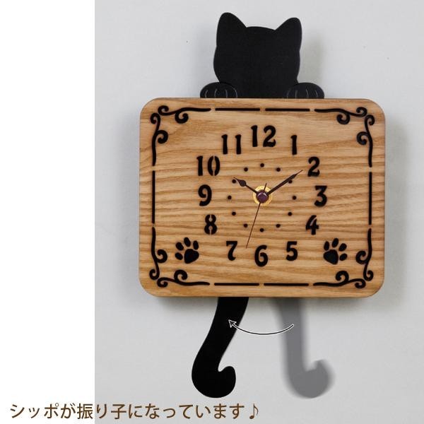 | ナチュラルな木目を生かした文字盤はレーザー柄で落ち着いた雰囲気。ちょこんと顔を出した黒猫の尻尾が振り子になっています。 |