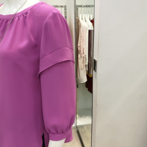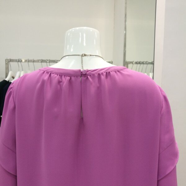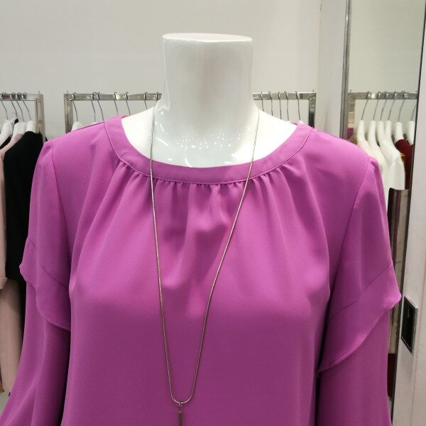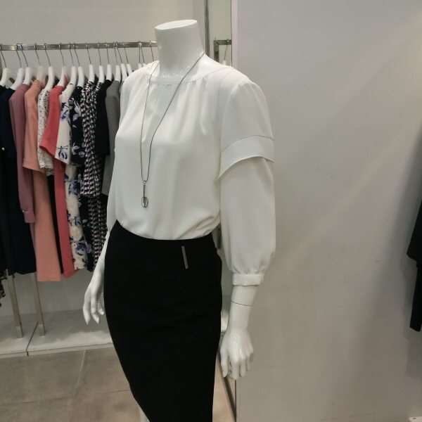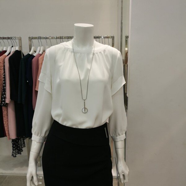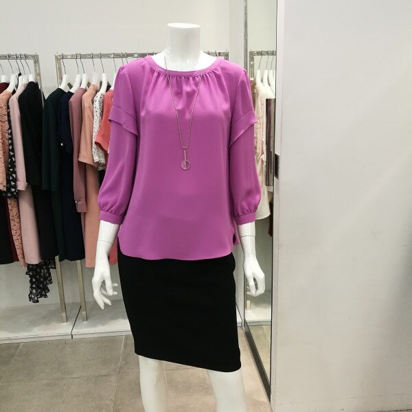 라운드넥에 살짝주름이 져있고 소매통 부분에 프릴이 있어 커버가되며 겉으로 내입어도 예쁘고 속으로넣어도 세련되고 고급스럽다.