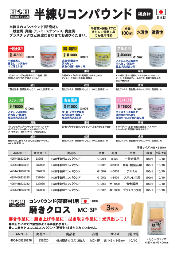 【商品名】 (業務用30セット)H&H 半練コンパウンド/研磨材 【真鍮用/容量:100ml】 日本製 水溶性/微香性 G100Y イエロー(黄) 〔業務用/DIY用品/彫金等〕 【ジャンル・特徴】 手作業又は各種場布に塗布して電動工具にも使用できる研磨剤 ■サイズ・色違い・関連商品■金属用 5セット■金属用 30セット■真鍮用 5セット■真鍮用 30セット[当ページ]■アルミ用 5セット■アルミ用 30セット■ステンレス用 5セット■ステンレス用 30セット■貴金属用 5セット■貴金属用 30セット■プラスチック用 5セット■プラスチック用 30セット ■商品内容 【ご注意事項】・この商品は下記内容×30セットでお届けします。真鍮・銅製品の汚れ取り・変色の緩和・傷取り用用途:仏具・ドアノブ・手すり・真鍮製アクセサリーやアンティーク物などの真鍮・銅製品■商品スペック容量:100ml成分:酸化アルミナ、脂肪酸ナトリウム、WAX、防腐剤、水粒度:#1000水溶性 微香性手作業・各種バフに塗布して電動工具にも使用可能■送料・配送についての注意事項●本商品の出荷目安は【1 - 7営業日 ※土