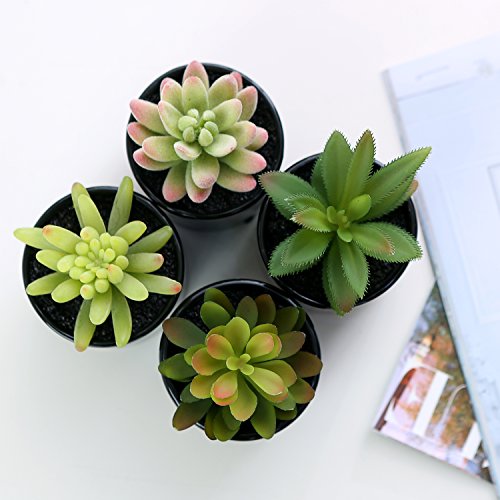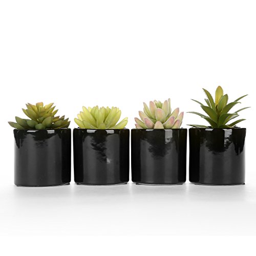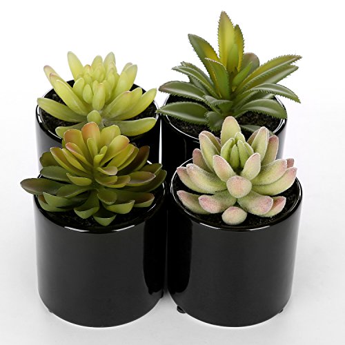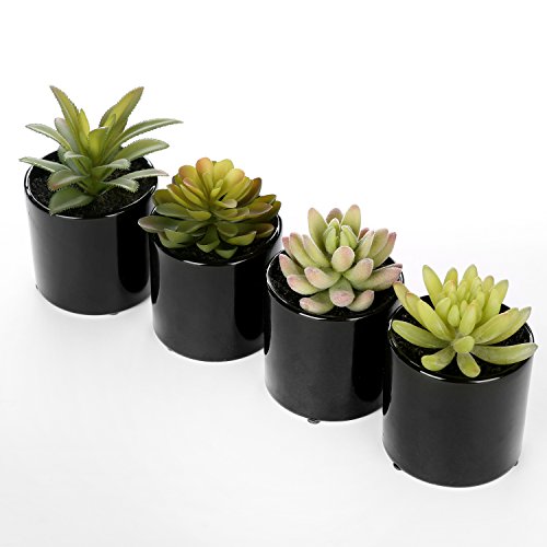 Show off your elegant, modern taste with this set of 4 artificial succulent plants. Each small, synthetic plant features its own unique design and is housed in a glossy black ceramic pot that adds a touch of modern style to your space. These charming artificial plants allow you to bring the natural-looking greenery of the garden into your home without any of the mess or upkeep. Whether you display these faux succulent plants on your windowsill, desktop, or dining room table, they're sure to bring vibrant new style to your home or office.**Official MyGift® product.**