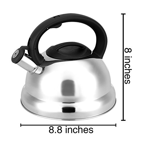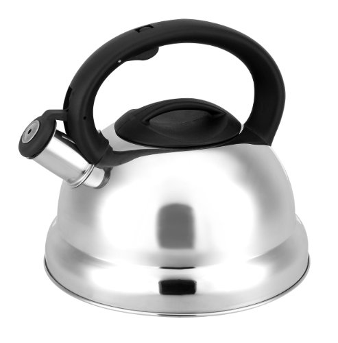 This high capacity kettle whistles when boiling and has cool-to the-touch black handles and knobs. This kettle has a3-ply base and is induction compatible.