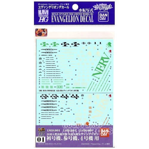 -. Binding : Toy -. Brand : Bandai Hobby -. EAN : 4543112390868 -. Feature : No glue required for assembly, a hobby nipper is required to remove parts from runners / Colored plastic, little to no paint required to replicate appearance / Product bears official Bluefin Distribution logo ensuring purchaser is receiving authentic licensed item from approved U.S. retailer / Bluefin Distribution products are tested and comply with all U.S. consumer product safety regulations and are eligible for consumer support -. IsAdultProduct : 0 -. Label : Bluefin Distribution Toys -. Manufacturer : Bluefin Distribution Toys -. Model : BAN139086 -. MPN : BAN139086 -. PackageQuantity : 1 -. PartNumber : BAN139086 -. ProductGroup : Toy -. ProductTypeName : TOYS_AND_GAMES -. Publisher : Bluefin Distribution Toys -. Studio : Bluefin Distribution Toys -. Title : Bandai Hobby ED-01 Evangelion LMHG001/005/009 Decal Set (Bag/6) -. Warranty : No Warranty