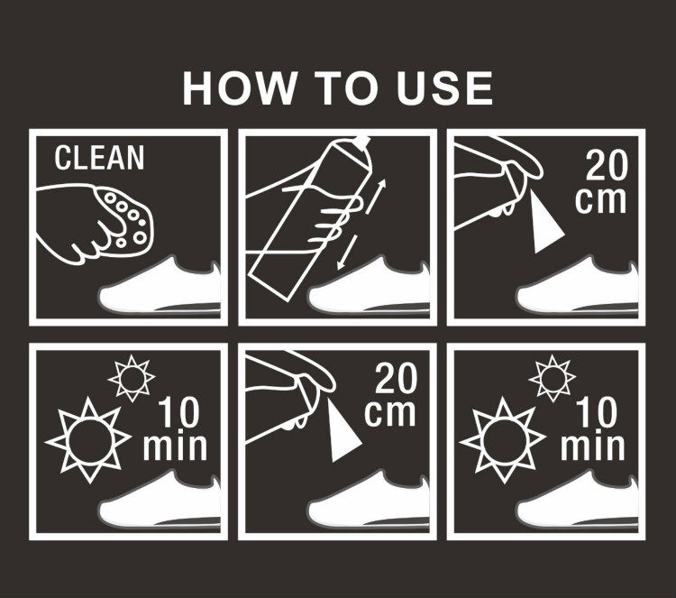5、使用方法:①清洁鞋面后, 在距离鞋面 20cm 处喷洒均匀;② 放置 10 分钟;③ 再次距鞋面 20 cm处喷洒均匀;④ 放置 10 分钟后,完成处理。