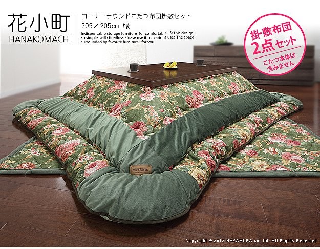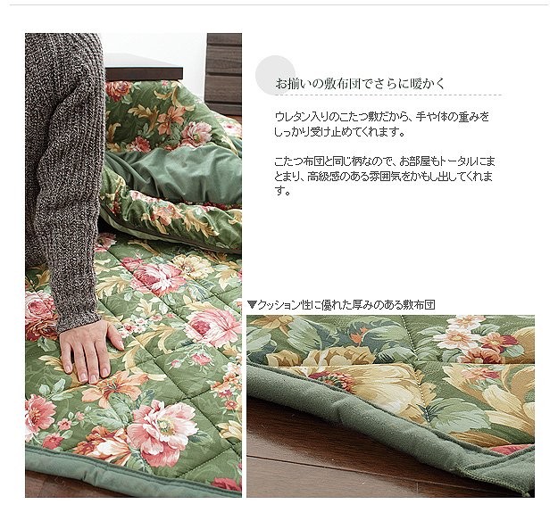 商品について:上品な花柄のこたつ布団セット。角が丸くコーナーがはみでないのでスッキリ!中綿を贅沢に使用しているので、暖かさが違います。お揃いのこたつ敷きでさらに暖かく、お部屋もトータルにまとまります。