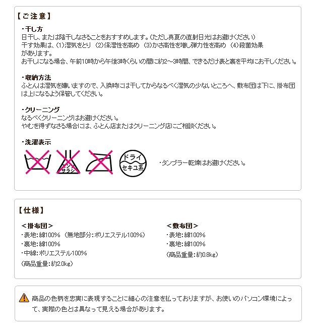 サイズ(cm):〔掛布団〕205x205・中綿量約2.0kg、〔敷布団〕190x190・中綿量約0.8kg