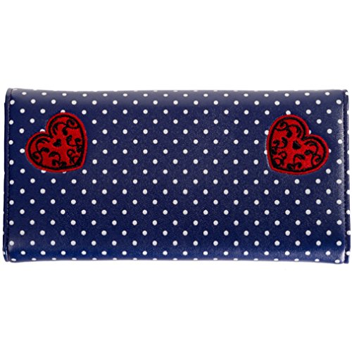 Binding : Apparel Product Description - Material: 100% Polyurethane, Lining: 100% PVC - Dimensions: approx.19,5 x 3 x 10 cm - All-Over polka dot pattern - Embroidered swallows and heart on front - Embroidered heart on back - Snap-button closure - Zip compartment for coins - Two large compartments for bank notes - 13 credit card slots, including one transparent one - Two bank note sized side slots