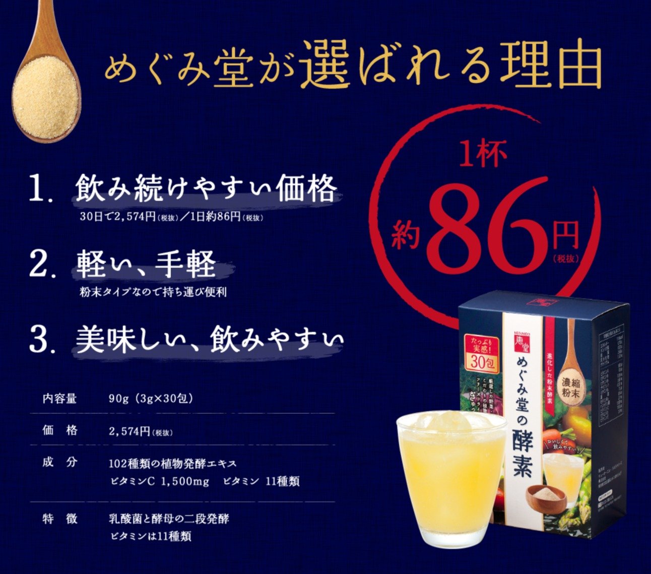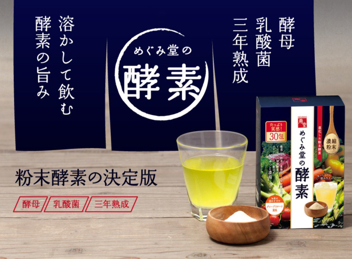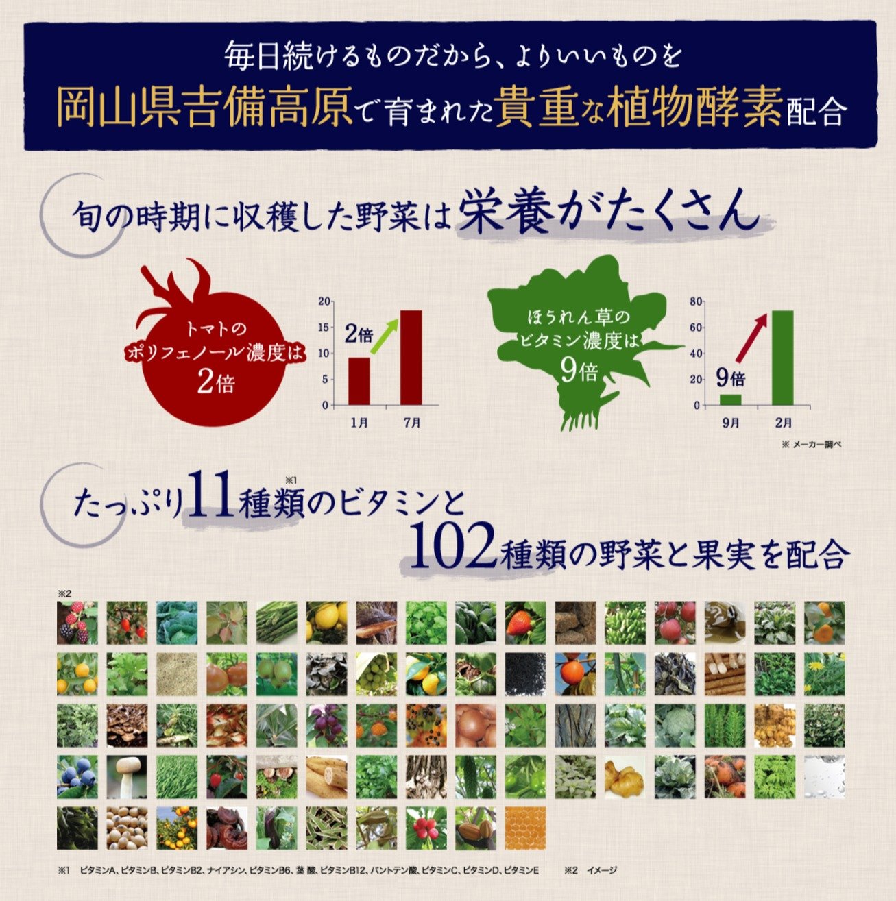 植物発酵エキス末(デキストリン、プルーン、ヨモギ、大豆(遺伝子組換えではない)、イチゴ、リンゴ、ブドウ、モモ、ミカン、ユズ、柿、シソ、カボチャ、レイシ、ダイコン、日本山人参、ホウレンソウ、ニンジン、ケール、大麦若葉、モロヘイヤ、コンブ、玄米、トウモロコシ(遺伝子組換えではない)、キウイ、キンカン、シイタケ、米ぬか、トマト、レモン、ココア、キクラゲ、ワカメ、ヒバマタ、根コンブ、ブルーベリー、キュウリ、アケビ、ヤマモモ、アカメガシワ、オオバコ、クマザサ、スギナ、ビワの葉、キャベツ、マイタケ、ヒジキ、ナスビ、小松菜、セロリ、ナシ、ピーマン、ゴーヤー、チンゲンサイ、ウメ、レンコン、ウコン、イヨカン、ビタミン菜、イチジク、ヤマブドウ、ゴボウ、ブロッコリー、ショウガ、カリン、パセリ、アスパラガス、セリ、キイチゴ、ミツバ、ミョウガ、グミ、ブラックベリー、冬イチゴ、カンダバー、サクナ、クワンソウ、野菜パパイヤ、紅イモ、島ニンジン、島カボチャ、ニガナ、ウンチェー、シマナー、ハンダマ、イーチョーバー、オオタニワタリ、シカクマメ、シブイ、タイモ、チシャナバー、ナーベーラー、ノビル、フーチバー、フーロー豆、モーウイ、ヤマン、ンスナバー、島ダイコン、島ラッキョウ、葉ニンニク、黒砂糖、ニゲロオリゴ糖)、コラーゲンペプチド、乾燥ビール酵母、穀物発酵エキス、アセロラ末、カムカム(果肉)、桑の葉エキス末、V.C、トレハロース、甘味料(アセスルファムK、スクラロース)、L-シスチン、V.E、ナイアシン、香料、パントテン酸Ca、V.B1、V.B6、V.B2、V.A、葉酸、V.D、VB12、(原材料の一部に、小麦、大豆、ゼラチン、リンゴ、モモ、キウイフルーツを含む)