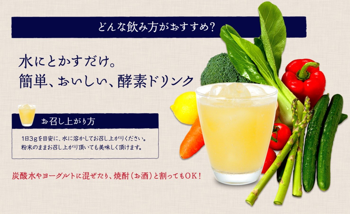 ●商品説明:厳選した野菜・果物などを3年以上熟成し、乳酸菌と酵母のW発酵した植物エキスをフリーズドライ製法で仕上げた粉末酵素飲料です。お水に溶かすだけで手軽にお召し上がりいただけます。炭酸水に混ぜたり、ヨーグルト、焼酎(お酒)と割ったりなどアレンジしてもお楽しみいただけます。果物香料を使用。グレープフルーツ風味。