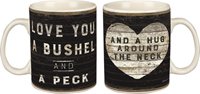 -. Brand : Heart of America -. Color : White -. EAN : 0883504303859 -. Feature : Coffee mug printed with the words "Love You A Bushel And A Peck" and on the other side "And A Hug Around The Neck" over a distressed wood background / 20oz. / Made of ceramic. -. Label : Heart of America -. Manufacturer : Heart of America -. MPN : 30385 -. PartNumber : 30385 -. ProductGroup : Kitchen -. ProductTypeName : KITCHEN -. Publisher : Heart of America -. Size : 20 ounce -. Studio : Heart of America -. Title : Love You A Bushel And A Peck And A Hug Around The Neck - 20-oz. Coffee Mug -. UPC : 755899954223