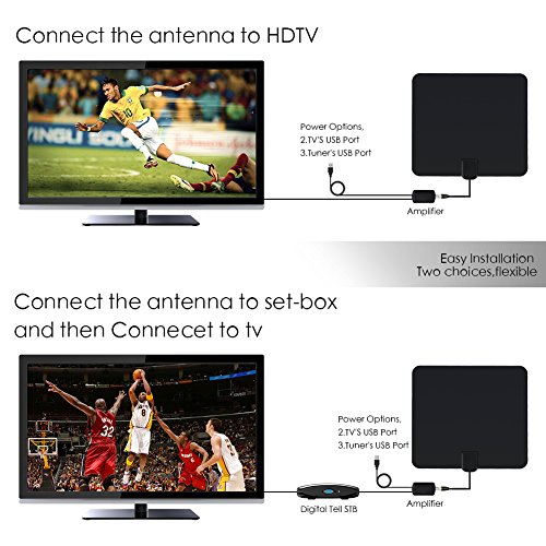 How to use 1. Connect the Freesat TV Antenna to the back of your TV coaxial receiver. 2. Power on the antenna by below ways Powered by TV's USB charging port Powered by Digital STB charging port Powered by External USB power adapter(not included) 3. Attach the Antenna on the wall or window, behind a picture, on a shelf or anywhere to get the best reception. 4. Select correct signal source and then start a channel scan with the antenna. If the reception is sporadic, move the antenna to another location and rescanning. 5. Enjoy your FREE TV program.