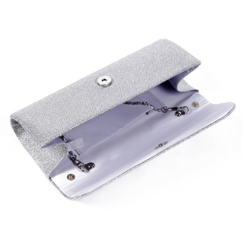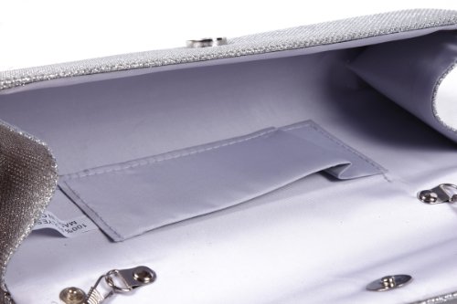 -. Brand : Damara -. Department : womens -. Feature : Made of glitter Pu Leather / Magnetic snap closure / Front shiny Rhinestones / 2 removable chain,a silver chains length is approximately 120cm (47.24inches),and a matched color glitter chain / Dimensions:10.25" x 4" x 2" (26.5x10x5cm) -. ProductGroup : Shoes -. ProductTypeName : HANDBAG -. Size : medium -. Title : Damara Womens Oblique Flap Glitter Clutch Handbags