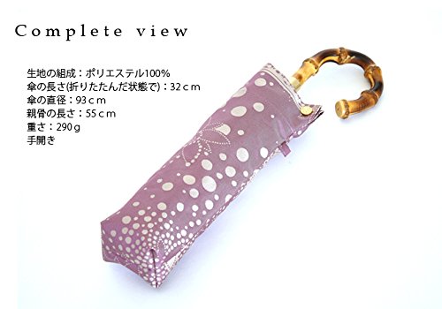 -. Feature : 【製品素材】・傘地:ポリエステル(防撥水加工) / ・親骨:アルミ、8本 ・中棒:アルミ ・持ち手:竹材 / 【傘の長さ】(折りたたみ時)約32cm 【傘の直径】約93cm 【親骨の長さ】約55cm / 【重量】約290g,手開き式 / 生産国:日本(Made in Japan)