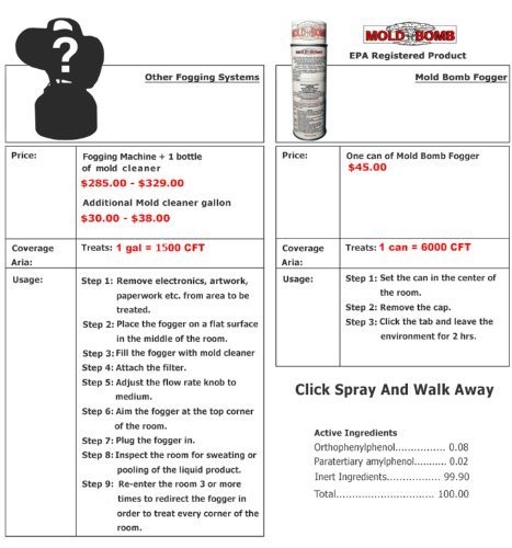 -. Feature : Easy to use mold fogger, Prevent mold from becoming a growing problem. Mold Bomb Kills mold in just one treatment. Our revolutionary one of a kind delivery system will get places you cannot reach with any other product. Mold Bomb works great for mold suppression, prevention, contents, rooms, appliances, eliminates odors, and disinfects surfaces. Don't risk a bigger mold problem when you already have with a less effective cleaner. Go with a product that works, "Mold Bomb"! / Easy step by step directions on how to activate your mold fogger. (1) Place Mold Bomb in the center of the room, or if there is visible mold growth, place the fogger near the site of contamination. (2) Simply remove the cap from the mold fogger and push the tab on the top of the can until it clicks and locks to begin fogging. (3) After releasing the mold fogger, allow to settle for two hours. / Mold Bomb will treat not only the room, but everything inside that room as well. For the best results use in conjunction with Biocide 100.