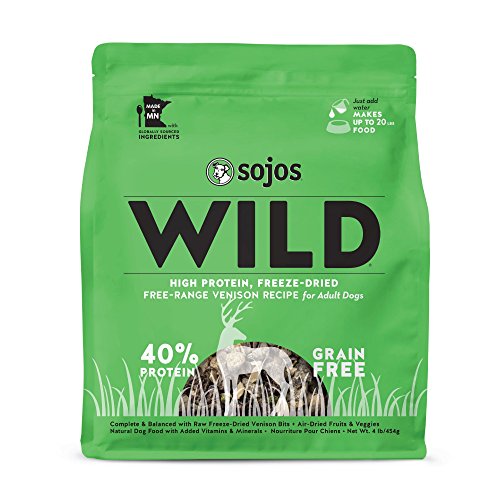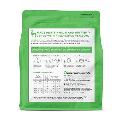 Sojos Wild Venison Recipe is a complete & balanced recipe made with raw freeze-dried venison bits + air-dried fruits & veggies. Freeze-dried Venison is a nutritional powerhouse. It’s packed with quality protein and other essential nutrients—all keys to whole body health and vitality. Add a balanced blend of farm-to-bowl veggies and fruits—and don’t be surprised if you find your dog howling at the moon.Feature