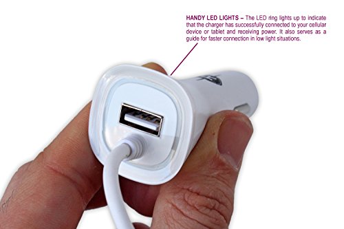 This 5v/2.4 Amp charger powers USB devices efficiently via the cigarette lighter receptacle of the car. Simply plug in the device and the red ring will light up, indicating the device is receiving power and is ready to charge.