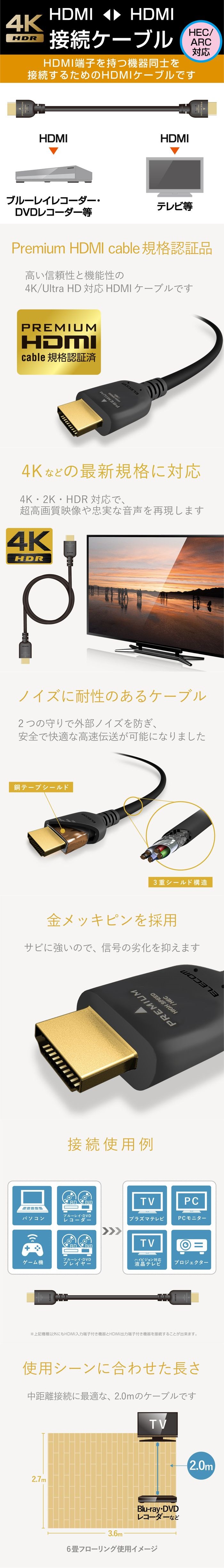 ●18Gbpsの高速伝送と高色域になった超高画質映像の伝送ができる、4K/Ultra HD対応のPremium HDMI cable規格認証済み“イーサネット対応Premium HDMIケーブル”。