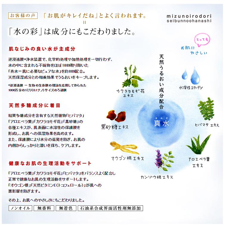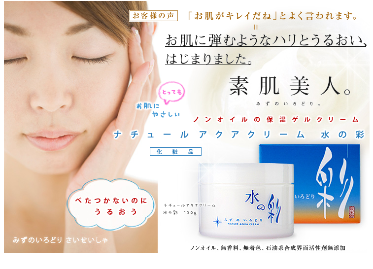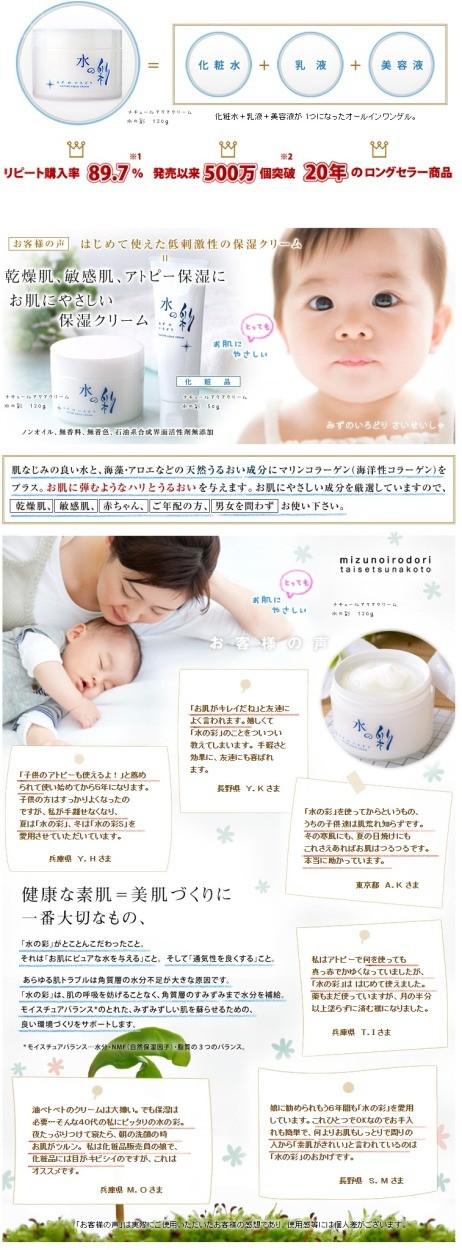 | 商品の説明 | ナチュールアクアクリーム 水の彩は、海藻やアロエ等の保湿成分に"真水*"を包み込み、ゲル状を保ったマイルドな使用感の保湿クリームです。たっぷりの水分と7種の天然うるおい成分の働きで、みずみずしい健やかな素肌へと導きます。ノンオイル・無香料・無着色、また石油系合成界面活性剤は使用しておりません。敏感肌の方にもおススメです。お顔はもちろん全身のスキンケアにお使いください。 |