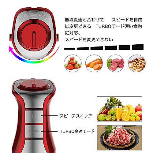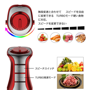 スープ、離乳食づくりややわらかい果物にはIモード(低速モード)、人参やリンゴのような固い果物のつぶしはTURBOモード(高速モード)がオススメします。スピードの強弱は握り方でラクラク調整できます。